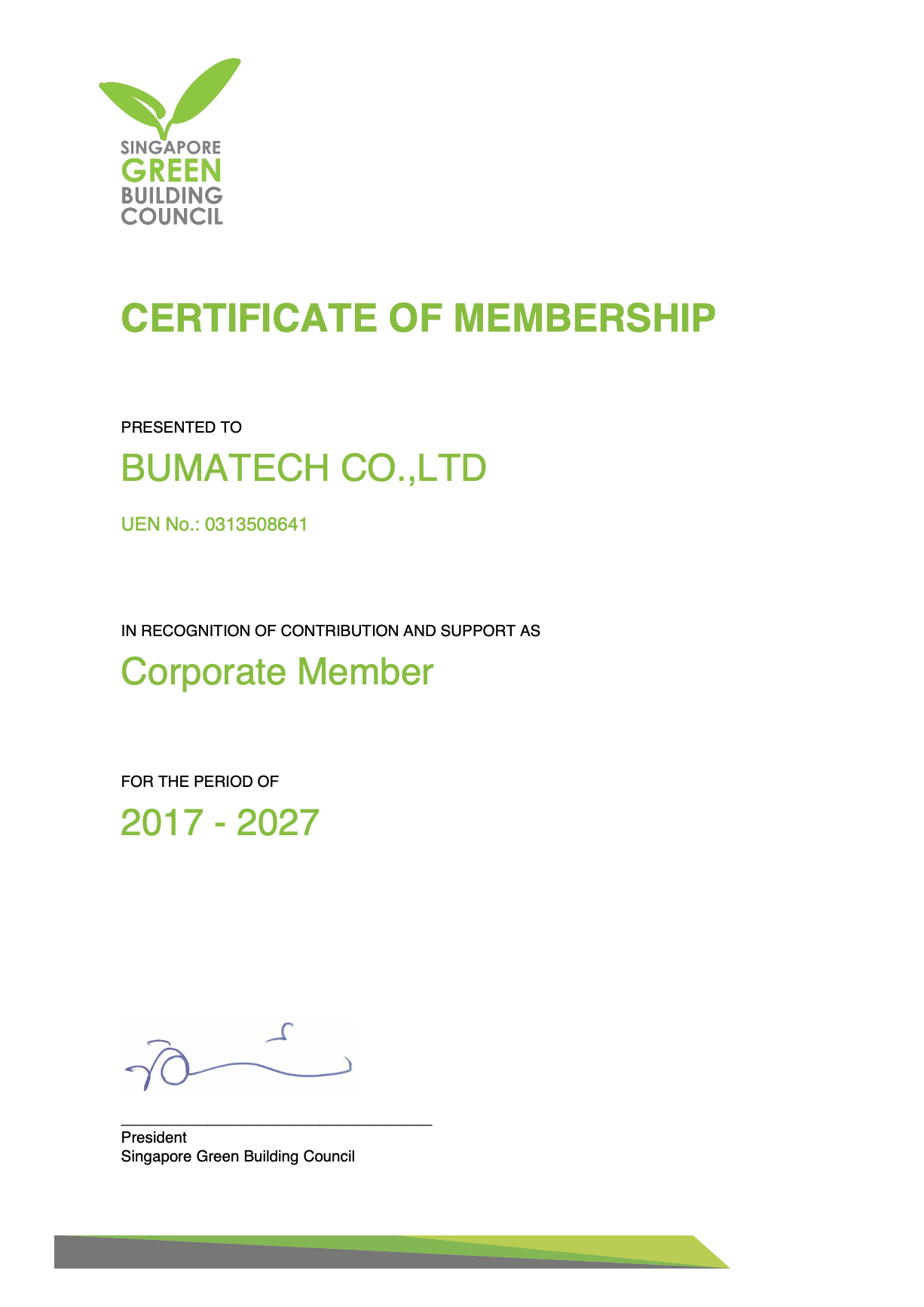 Từ năm 2017, BUMATECH chính thức trở thành thành viên của Hội đồng Công trình Xanh Singapore (SGBC) và Hội đồng Công trình Xanh Việt Nam (VGBC), khẳng định định hướng phát triển gắn liền với xây dựng xanh và phát triển bền vững ngay từ giai đoạn đầu hình thành doanh nghiệp.